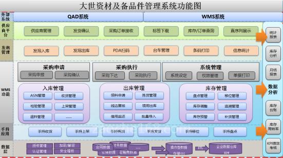 整个北汽大世WMS项目基本涵盖了其所有内部与库存管理相关的流程,主要分为6大块,包括成品座椅、生产资材、发泡成品、备品件、劳保用品和IT设备。根据不同类型的物料,操作人员也会通过不同的设备和方式来操作WMS系统,包括自动化立体设备、PDA扫描枪以及PC系统。项目涵盖了日常物料的出入库、盘点、库存调整、采购订单下达、报表统计等流程。所有物料和设备基本都实现了条码化管理,同时通过接口的方式,将所有关联数据传给QAD系统,保证了财务账和实物账的统一。